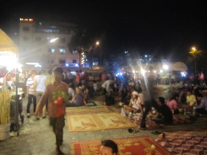 On Friday, Saturday and Sunday nights, along the riverside, tents are erected and a fair-style stage put up; vendors set up booths, teenagers with mediocre voices and sleep-walk-y dance moves perform on stage, mobile phone companies set up opposing stands with megaphones blasting promotions at one another, food stalls sell skewers of myserious deep-fried meat products, and diners take off their shoes and sit on straw mats, eating off thin wooden sticks. It’s nice. It’s a good mix of foreigners and Khmers, the riverside breeze is sweet, and until the mosquitoes drive you away, it’s pretty fucking luxurious to sit out and enjoy the night.