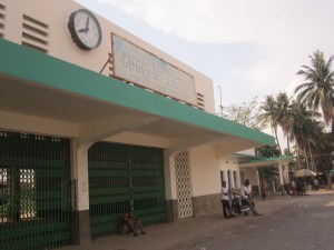 We walked down to the abandoned train station, a sweltering sidewalk lined with New Years decorations that look like tinsel pentagrams. During colonialism, the French built a train system in Cambodia, and it was still used through the 70s. I’ve read accounts of people who, early on in the Khmer Rouge reign, were transported to various work sites by train. At some point the system disintegrated, and the Battambang train station is proof of it, the clock out front permanently frozen at 8:02—a time that comes twice a day, like a train passing, but a year and date that remain silent, that will never pass by again.