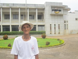 “Oh, it’s a man who lives here. He’s very old, 80, I think. He used to work at the factory before the war. After, he had no family, nowhere to go, so he came back. The government let him keep the grounds. He lives back there.” He waved his hand back towards the burned-out warehouse, where I’d seen laundry lines and pieces of cooked rice sitting in the sun.