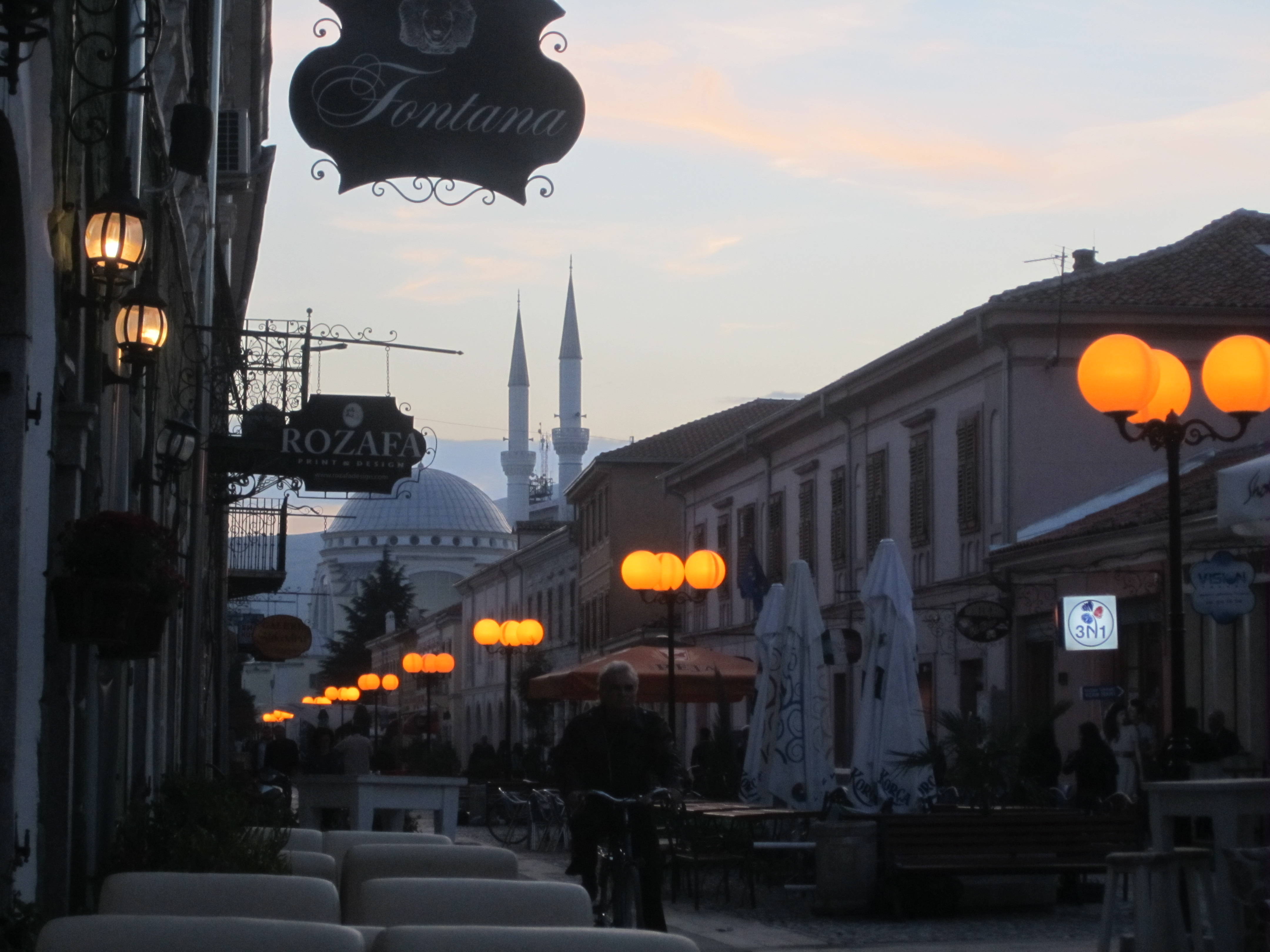 Click of heels on stones and bass of techno, bicycle chains and conversations. The lamps click on their orange glow, against the minarets and mountains. Two men in business suits behind me, speaking accented English and I have to turn and look, have to stop and snap a photo of the pedestrian walkway—Albanian for picturesque, which means that if you take a picture just of it then it could be Croatia or Montenegro—leave out the tin roofs and rubble, cats in the trash and the smell of something rotting, which you couldn’t photograph anyway. A chill and I check my phone for a text that hasn’t come.