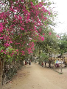 We made a few other stops, finally pulled off and bumped slowly down a dirt road. The landscape changed—more cows, bone white and skinny-ribbed, flowering trees I hadn’t seen elsewhere. The houses were suddenly different too—thatching for walls as well as roofs, so the structures looked furry, like animals.