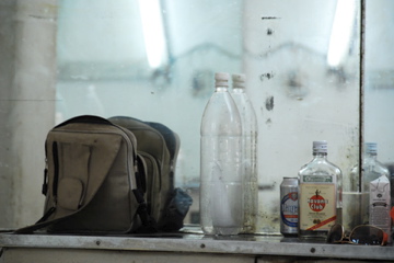 I shut the door behind me. I intend to go wait politely on the edge of the bed, but the camera appears in my hands. I creep towards the door, inch it open. He’s squatting in the middle of the room, veins bulged in concentration, with the black bag clutched under him. I get him in the frame; the camera clicks.