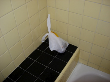 He emerges from the bathroom a couple minutes later, eyes down. “Well?” I ask. He looks at me, nods. I peer in the bathroom; he’s neatly tied the handles of the bag and set the bundle on the edge of the tub.