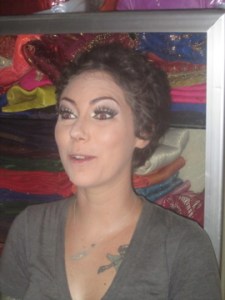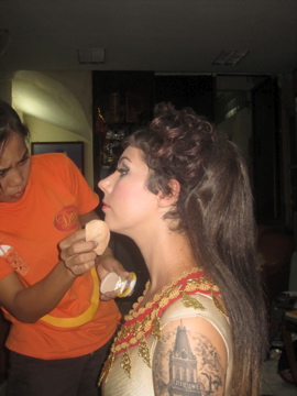 There was only one girl doing hair and make-up; at about thirty minutes each, we ended up being there for a loooong time. My friends chose the $10, more modestly ridiculous options; I opted for the $15 Apsara extraordinaire, which included more fanciful skirt folds, extra fake-gold bangles, even a wig. Behold the transformation: