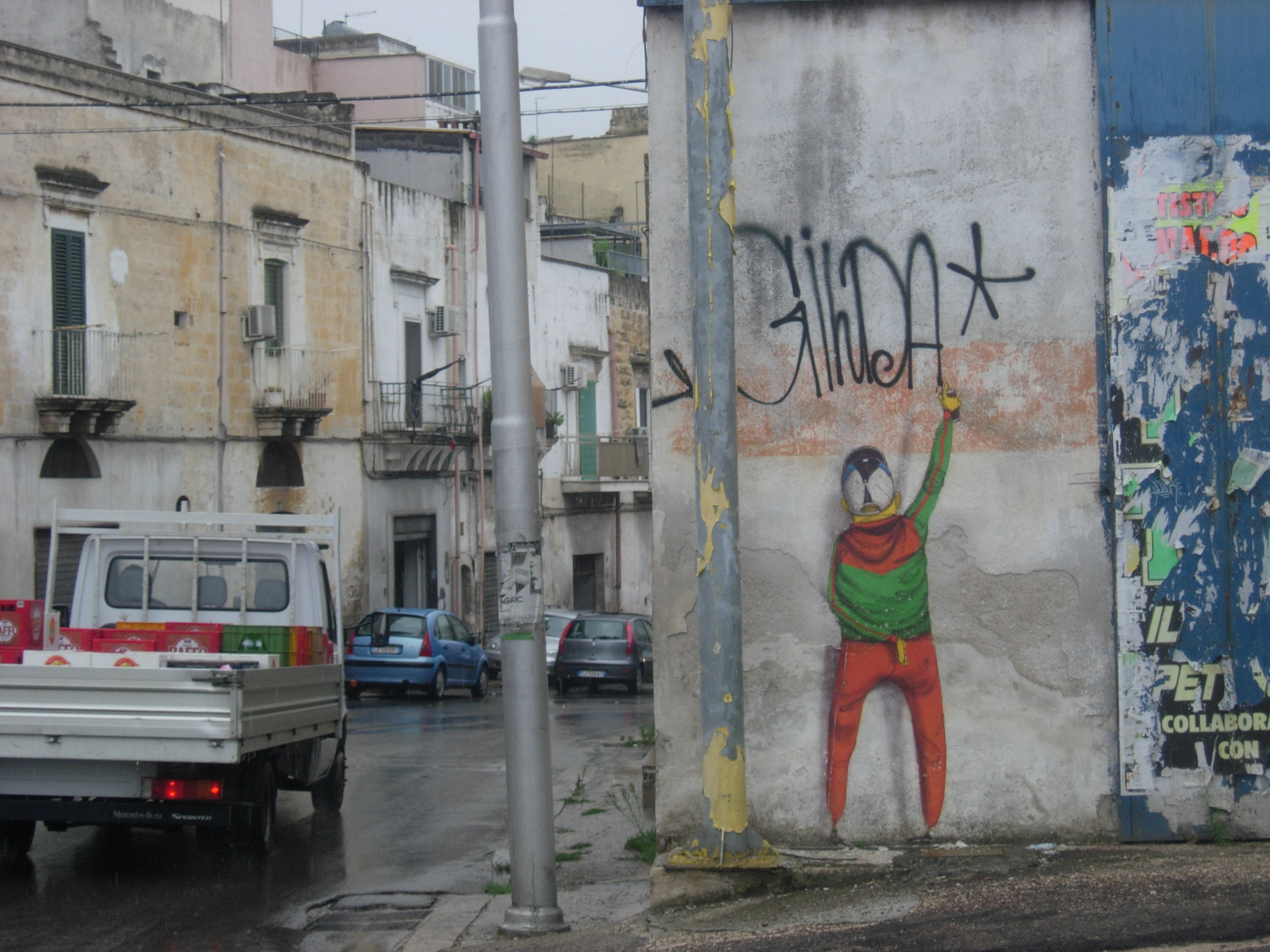 You’ll circle the perimeter of the roof with your new friends. You found them all—you found each other—like a rag-tag team of adventurers in some cartoon: Rebecca at a cafe, Pedro as you walked through the Old Town, then Greg as he feverishly rode a bicycle away from a herd of grazing animals (“Were they rabid?” “No.” “What were they doing?” “I dunno, they were just in the road. It was some weird country shit.”). You’ve all come alone, all flown from your various big cities to Grottaglie, for nothing more than the love of street art. And adventure.