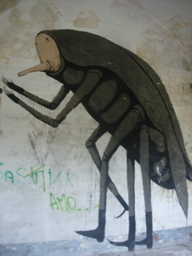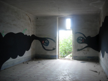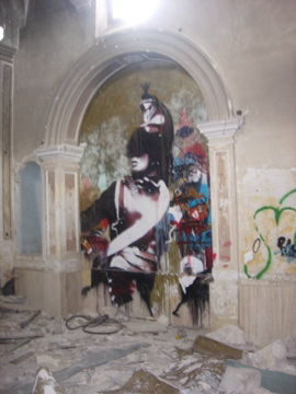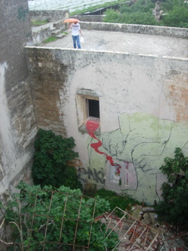 And you will have gotten there. You’ll have gotten to the moldy, peely, crumbling core of What It Is You Came For. Over the last three years of Fame Festival, the abandoned Convento dei Cappuccini has amassed works by visiting artists on its decrepit old walls. It’s become something of a museum of anarchic awesome—where you crunch through the broken glass, through rooms and rooms with bleeding walls; down dank stairways where the mosquitoes buzz and the light don’t shine; down into the guts and internal organs of an abandoned holiness left to rot, left to reborn in the last gasps of its decomposition, its swallowing-back-up by the earth, by the weeds, by the green; left to the artists and the vandals and the punk little kids with bruises on their knees, to the foreigners that don’t speak the language but know that urgent lonesome in the howling of the wind, the coming of the storm, as it blows through the broken windows and walks alongside you.