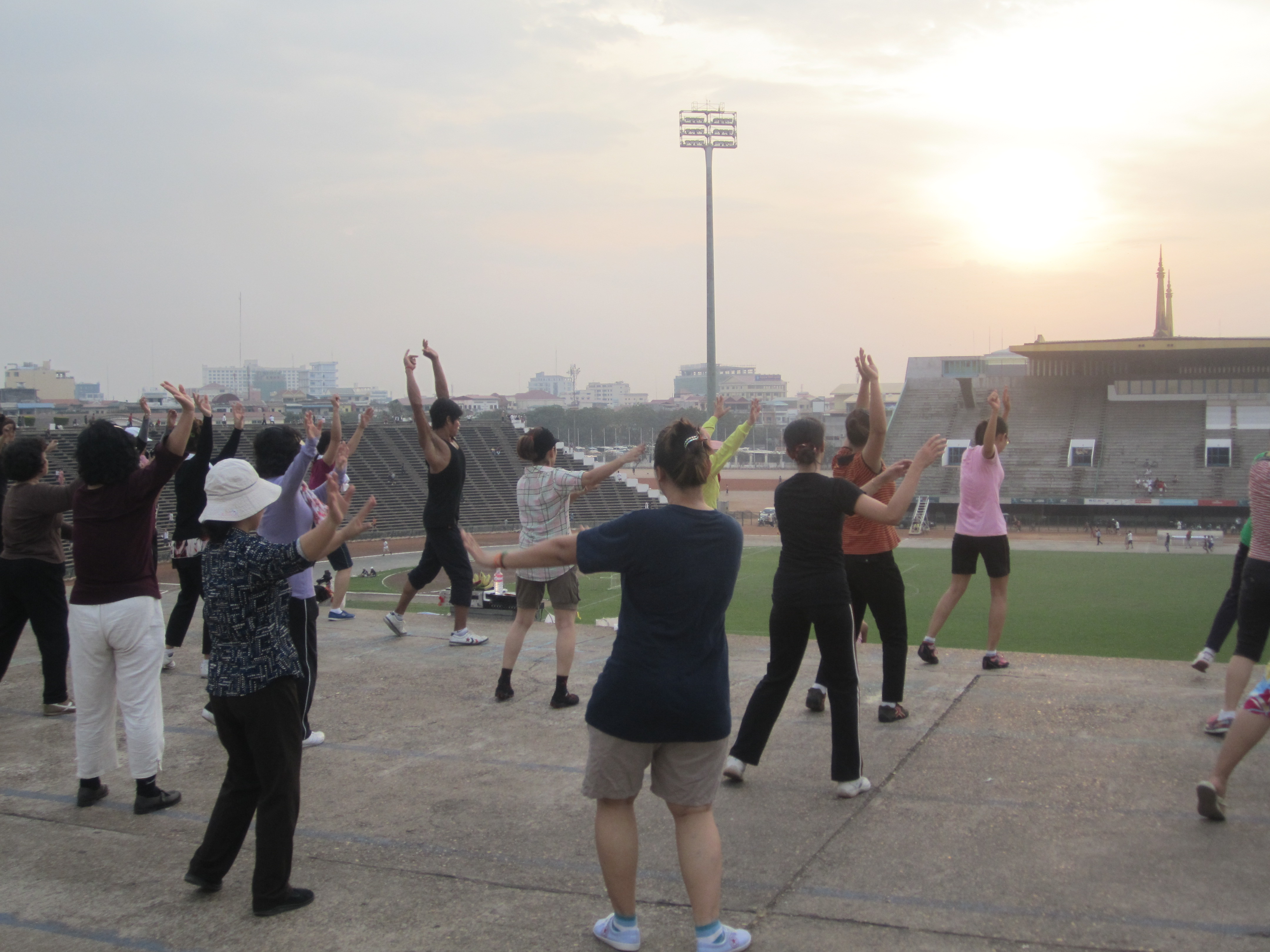 Holy shit, I think. Olympic Stadium is in the city center, near the guesthouse I stayed at when I arrived. Every dawn and dusk, they do aerobic dancing there, and people run and powerwalk and swing their limbs around; food vendors set up carts and plastic stools, and men play soccer in the dirt lot outside.