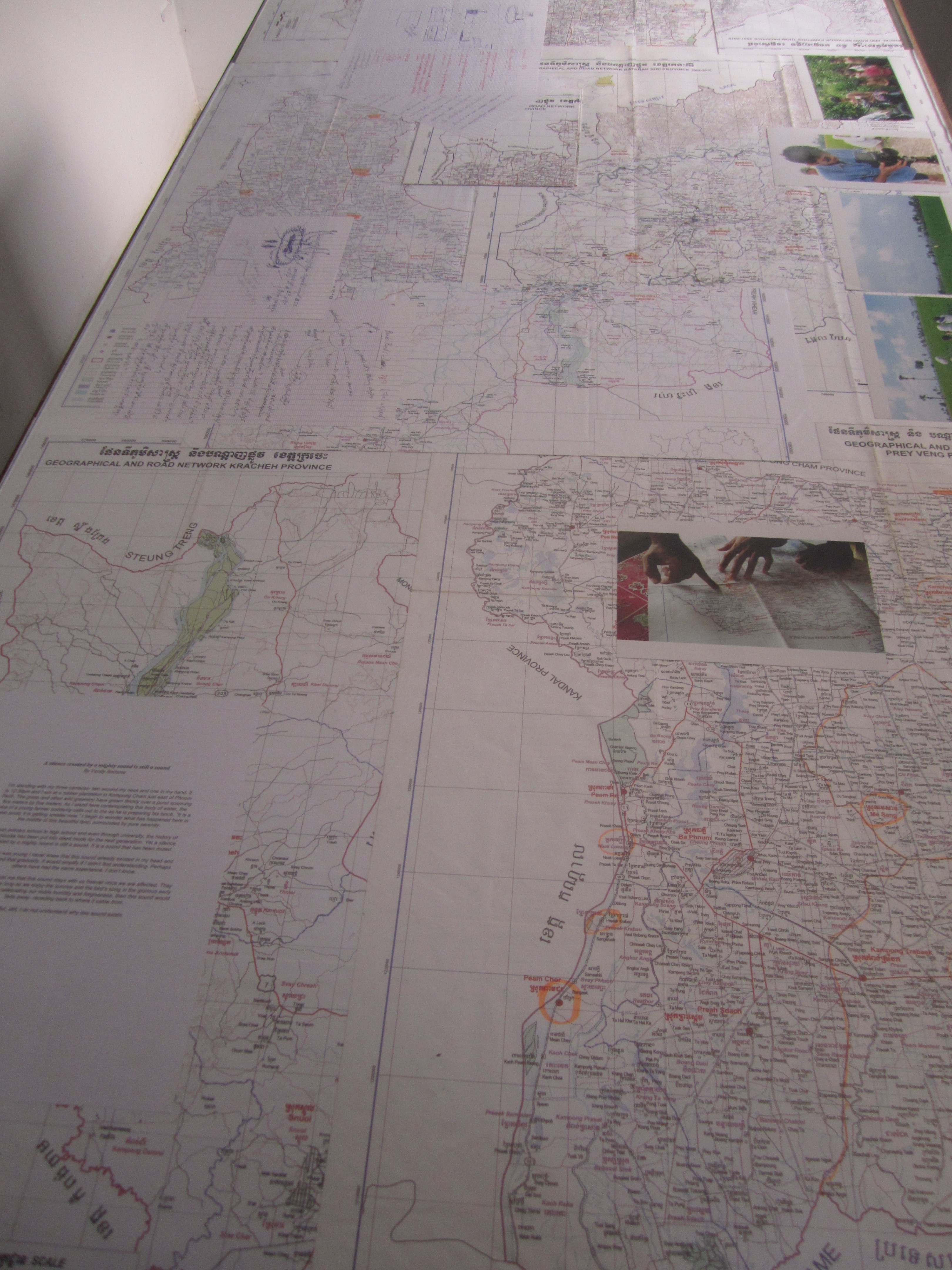 In a back room, sweaty and lit by sunlight, was a table laid out with maps from Rattana’s expeditions to the bomb ponds—black-and-white line drawings circled with highlighters, neon halos and Khmer scribblings. A single typed half-sheet of paper told a story, held a key, a small sound of knocking, knocking…