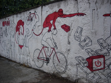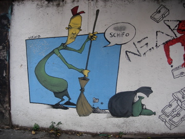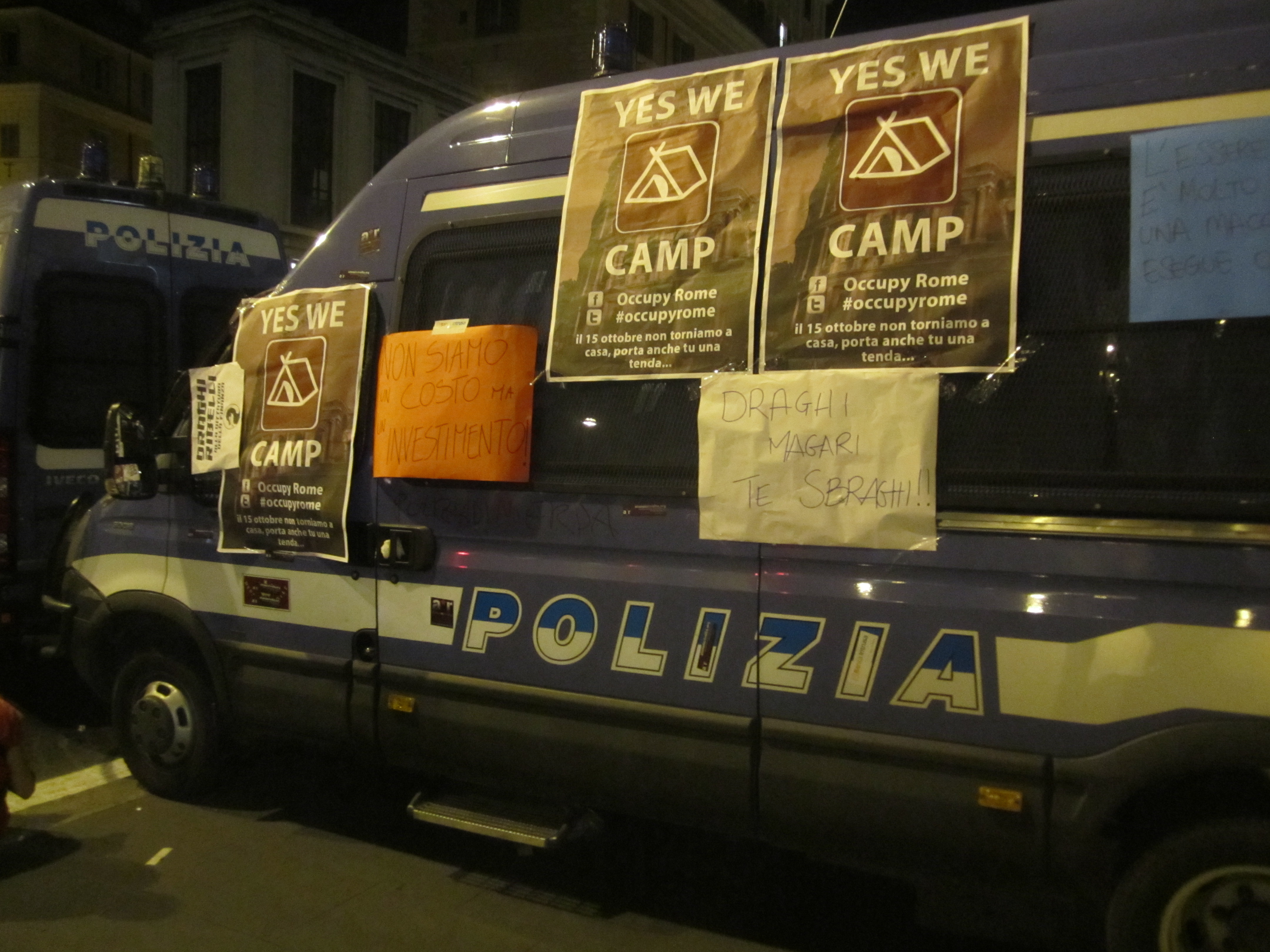 Nothing ever did. A couple of the police vans had signs taped to them: “Yes We Camp.” A sit-in/camp-in, a protest. I stay vaguely abreast of world politics enough to know that the economic situation in Italy is fucked—not as fucked as Greece, but not great. Unemployment is high, the economy’s in the shitter, and that day, October 12, it was announced that the Prime Minister would face a vote of no confidence.