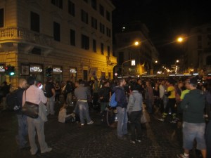 The steps of the Palazzo were littered with kids, 20-somethings, smoking and drinking and eating and talking and huddled up against a night that must have felt cold to them. Further down, near a makeshift mesh-fence of a police barricade, a couple hundred Roman young people milled around, toting signs and starting chants and calling into a megaphone and generally looking like they were waiting for something to happen.