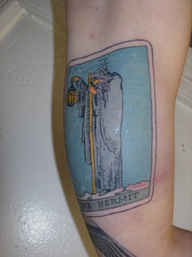 I suppose it would have been more accurate to get a feminized Hermit card tattooed, but the beard was too Zeppelin-y to forfeit. And I feel cheesy having an uber-symbolic tattoo, to finally have some kind of answer for the middle-aged customers that look up over their reading glasses at me and ask what my tattoos mean. Most likely, I shrug and continue to say, “I just thought they looked cool.” At least until this approach, this fetal manifesto, is a little more gestated.